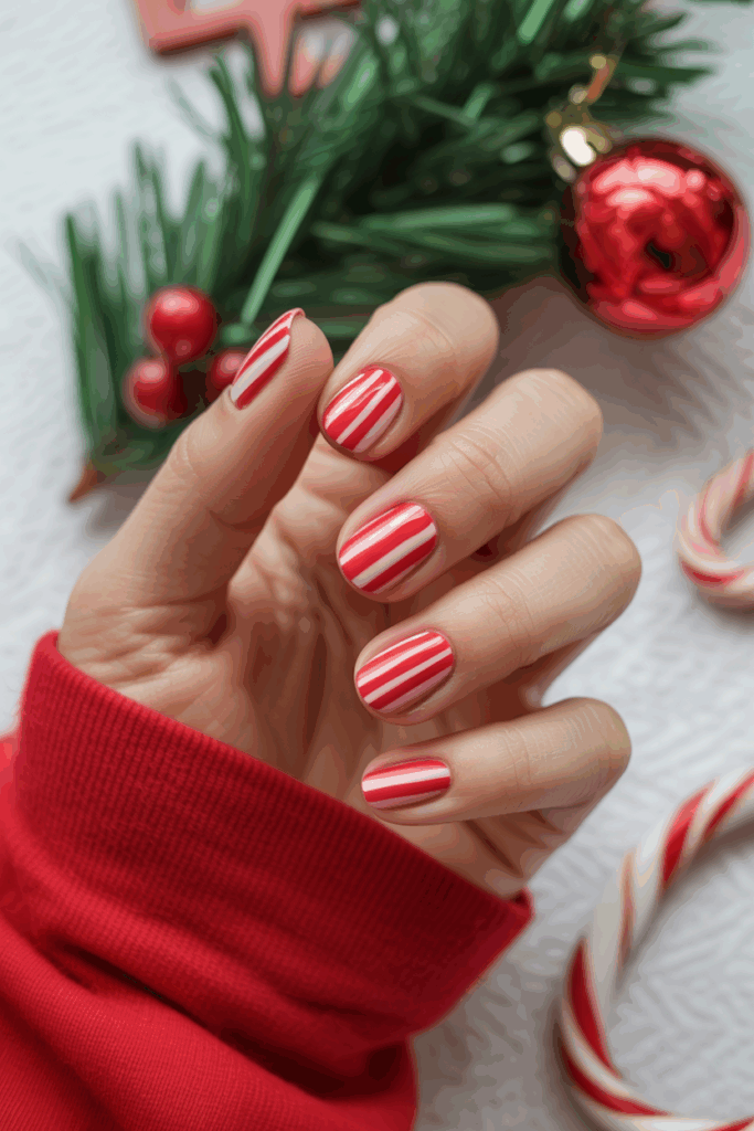 Candy cane stripe nails use red and white stripes to create a simple, festive look. They can cover the whole nail or be used as a border. Adding glitter or pastel colors offers a modern twist on this classic design.
