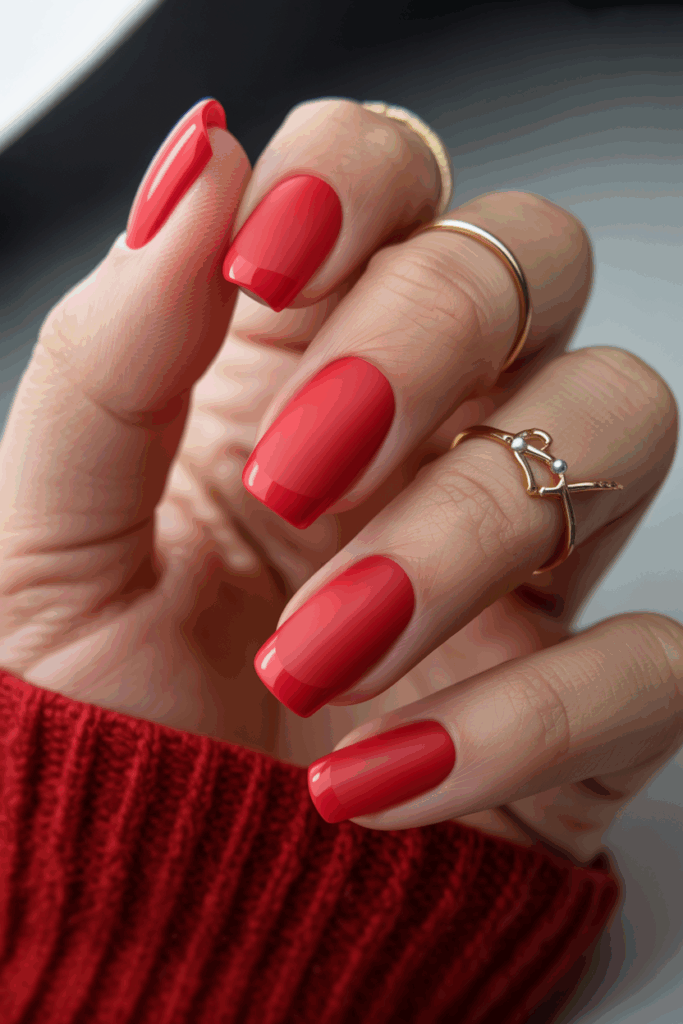 This design pairs a smooth matte red base with shiny, glossy ends. The contrast makes each nail stand out while keeping the look simple. It works well on both short and long nails.