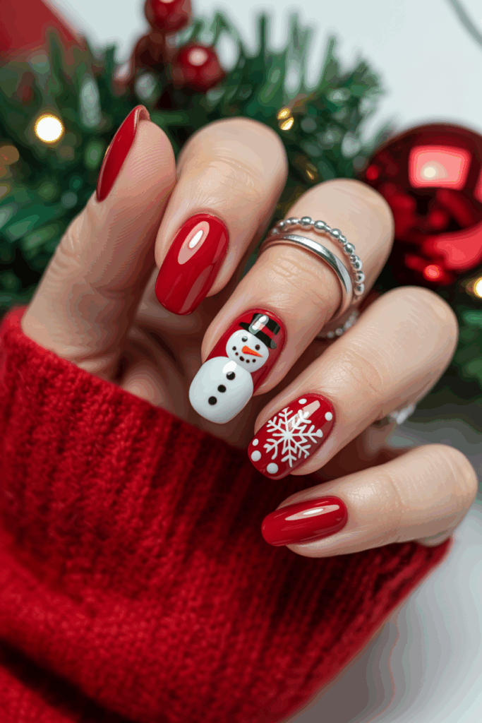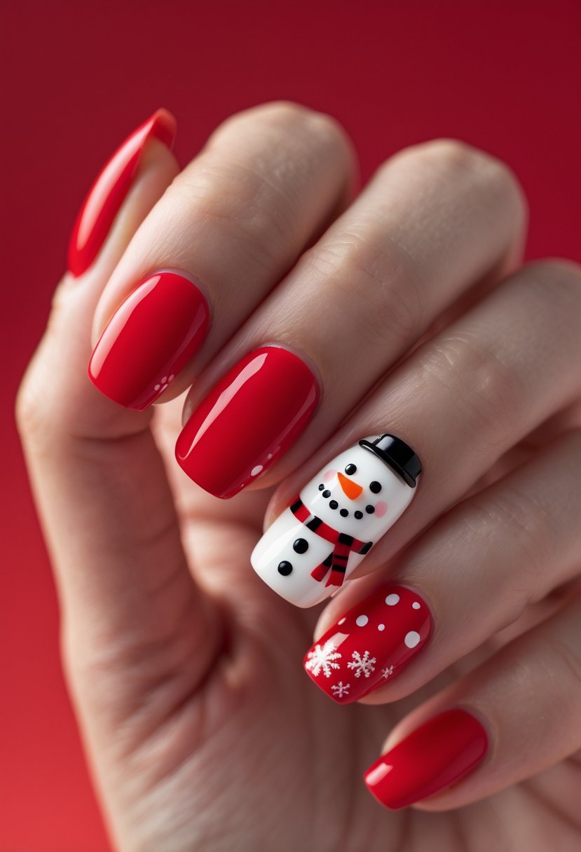 This design uses plain red nails with one or two nails featuring a simple snowman.