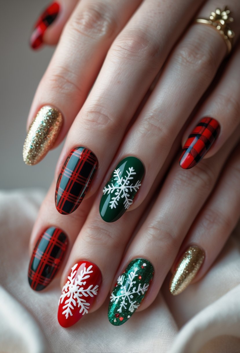 Plaid nails with gold highlights add a stylish touch to holiday manicures. The gold details create a subtle shine that makes the plaid pattern more elegant. This design mixes classic holiday colors with a bit of sparkle. It suits both casual and formal looks well.