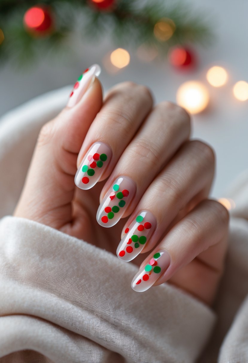 This design features clear nails decorated with small red and green confetti dots. The confetti adds a festive touch without covering the entire nail. It gives a simple, elegant holiday look that works well for any occasion.