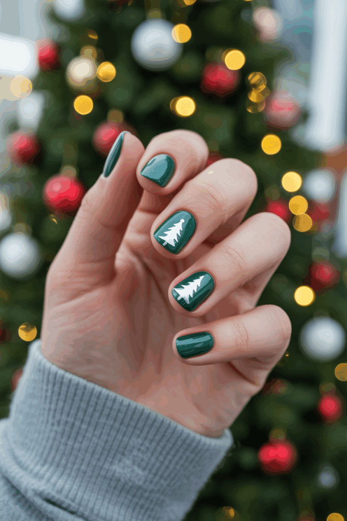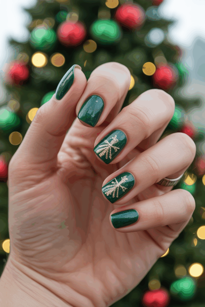 Deep evergreen polish is a chic alternative to traditional Christmas green. This shade feels elegant and modern, especially when paired with gold or silver accents. Evergreen nails bring sophistication to your holiday look and complement cozy winter wardrobes beautifully.