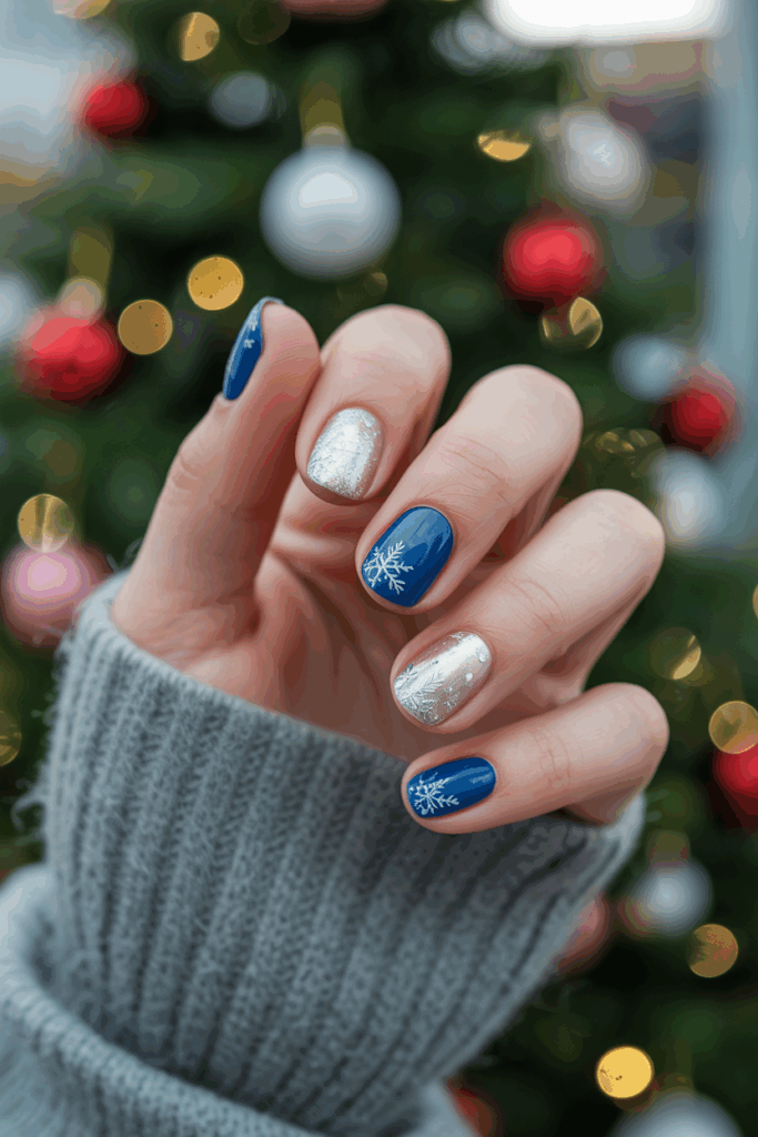 These colors are especially beautiful on almond and coffin nails, where the contrast can shine. Blue and silver nails also transition well into New Year’s, making them a versatile choice for December.