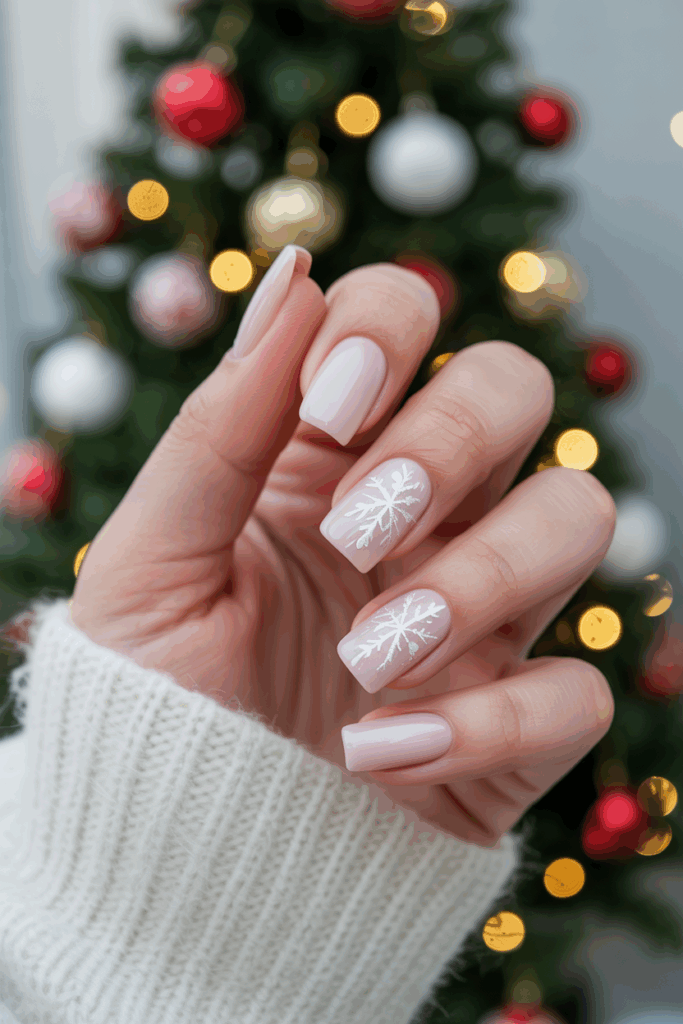 Snowflake designs work well on accent nails — for example, one or two decorated nails per hand paired with solid-colored polish. You can also layer snowflakes on a nude base for a minimalist yet magical look. Short, square nails make snowflake art feel crisp and modern, while long almond nails give it a dreamy, elegant finish.