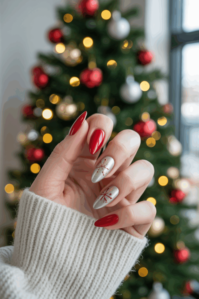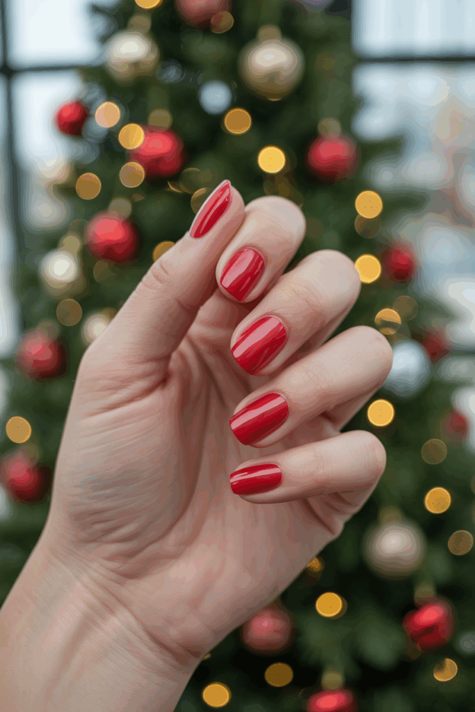 Nothing says Christmas quite like a perfect red manicure. This timeless look is festive, bold, and endlessly versatile, working with every holiday outfit. Choose a glossy scarlet shade for a traditional feel, or opt for deeper wine and burgundy tones for a more elegant winter vibe. Red nails also photograph beautifully, making them perfect for family pictures or holiday parties.