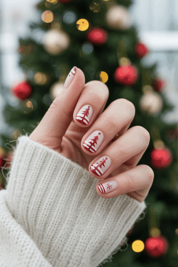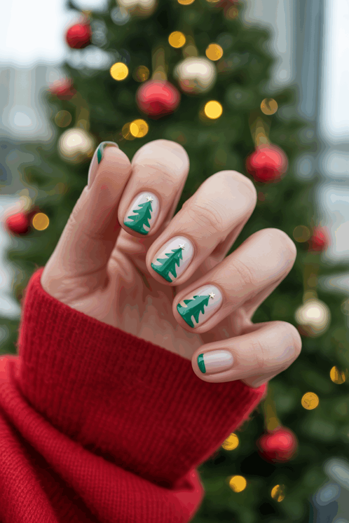 This design looks great against neutral backgrounds like nude or white polish. Short nails keep the trees simple, while longer almond or coffin nails allow for more detailed art. Christmas tree nails are a fun choice for family gatherings, cookie swaps, or decorating parties.