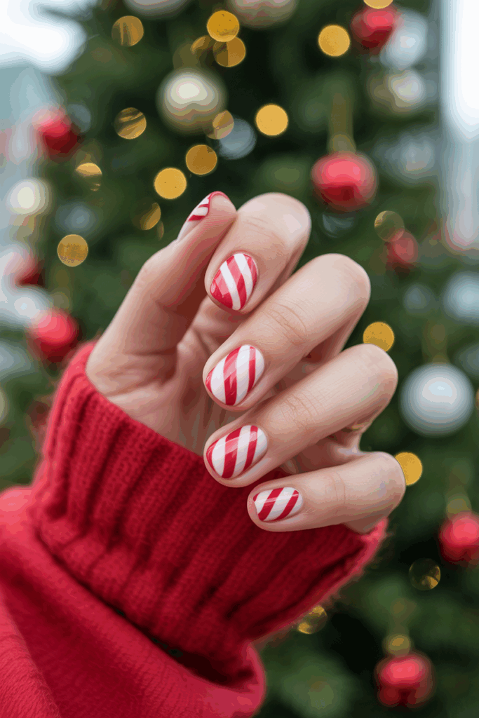 Candy cane nails are playful, sweet, and perfect for anyone who loves traditional holiday patterns. Bold red and white stripes instantly stand out and bring a touch of fun to your holiday manicure. For extra detail, consider adding glitter stripes or mixing in green for a more colorful effect.