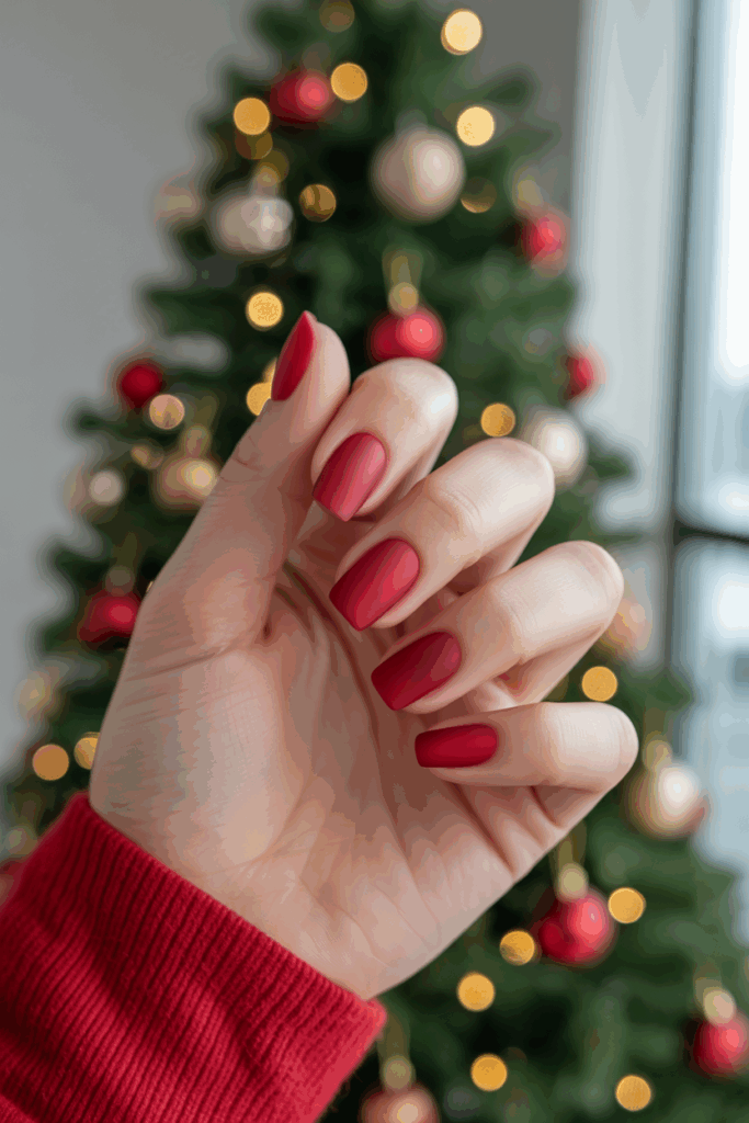 Matte finishes give red nails a modern edge. Instead of glossy shine, matte red feels bold, velvety, and sophisticated. This simple twist transforms classic Christmas nails into a chic statement look.