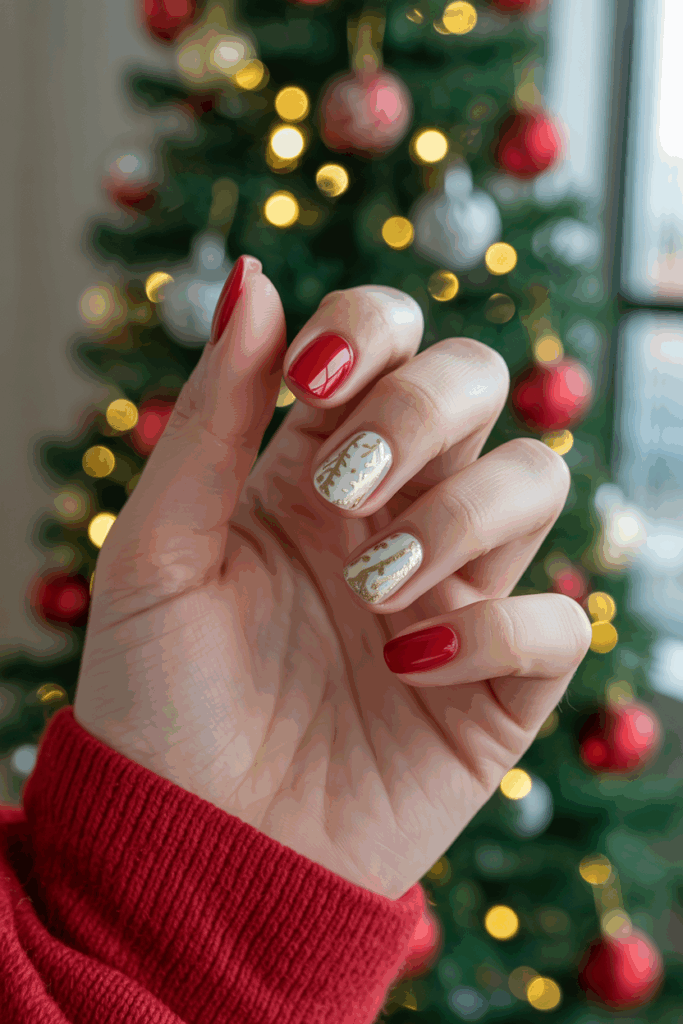Red and gold is one of the most elegant color pairings for Christmas nails. Rich red polish serves as the base, while gold accents add shimmer and sophistication. This combination can be simple — such as gold glitter tips — or more detailed, like intricate gold nail art over a red base.