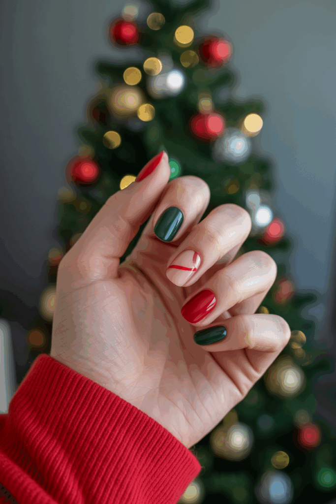 This style works especially well on short, square nails, but it’s just as striking on coffin or almond shapes. Add glitter polish or gold stripes for extra holiday flair. Red and green split nails are fun, vibrant, and guaranteed to get compliments.
