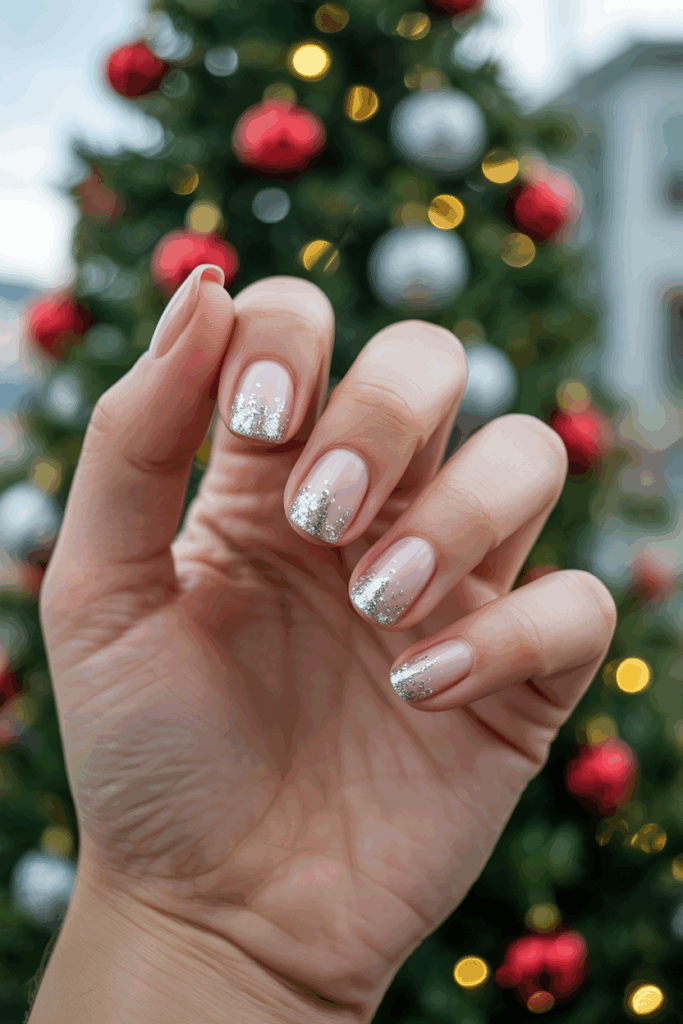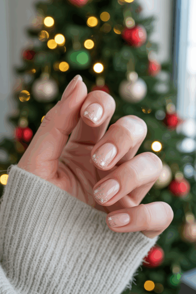 If you prefer a minimal look, nude nails with festive accents are perfect. A nude base feels elegant and versatile, while glitter tips, rhinestones, or subtle holiday art make them seasonal. This look is a great option if you want nails that transition smoothly from everyday wear to holiday celebrations.
