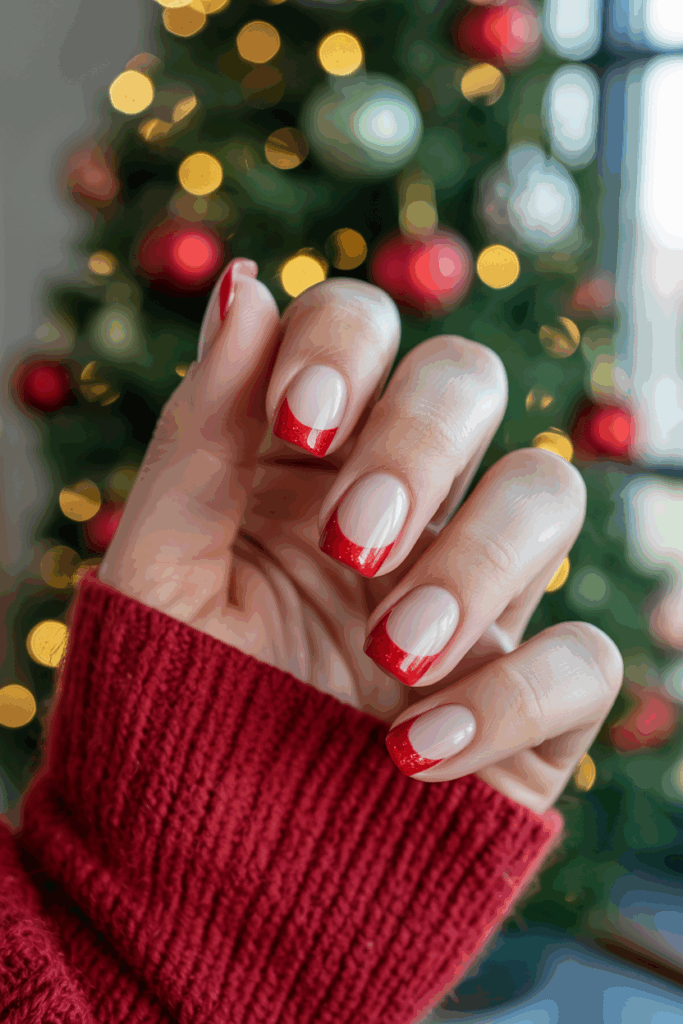 A French manicure with a festive twist — red glitter tips — is both classic and playful. The clear or nude base keeps the look simple, while glittery red tips add a bold holiday touch. This design is easy to wear and works beautifully on all nail shapes.
