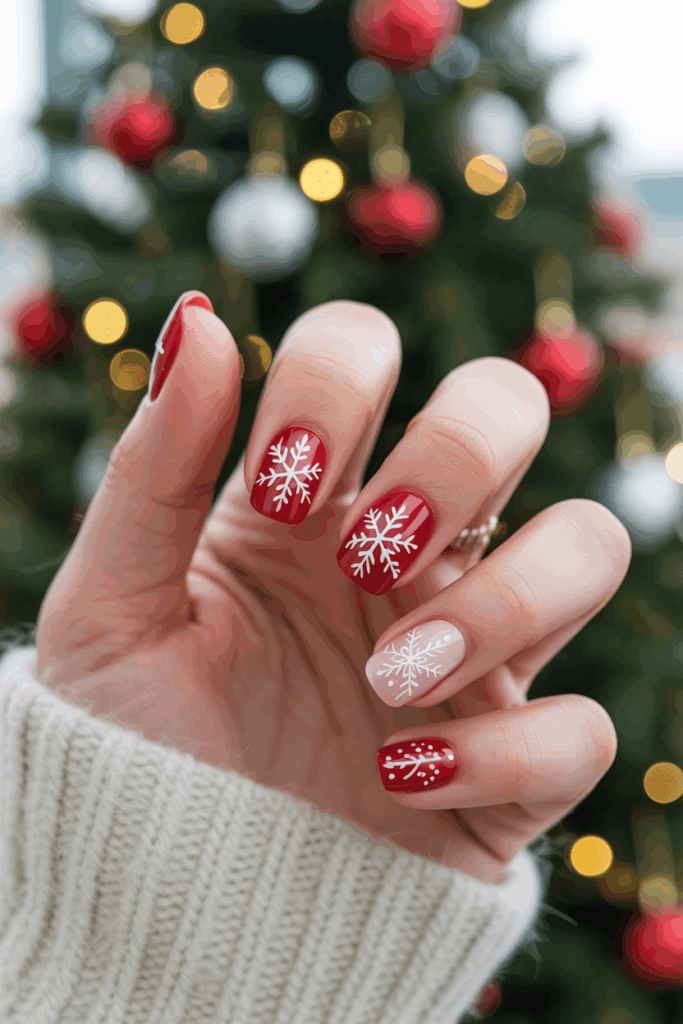 Snowflake nails are a whimsical, wintry option that captures the magic of the season. White snowflakes painted over red, green, or blue polish create a frosty, festive vibe. Adding glitter polish as a base enhances the snowy effect, making your nails sparkle like freshly fallen snow.