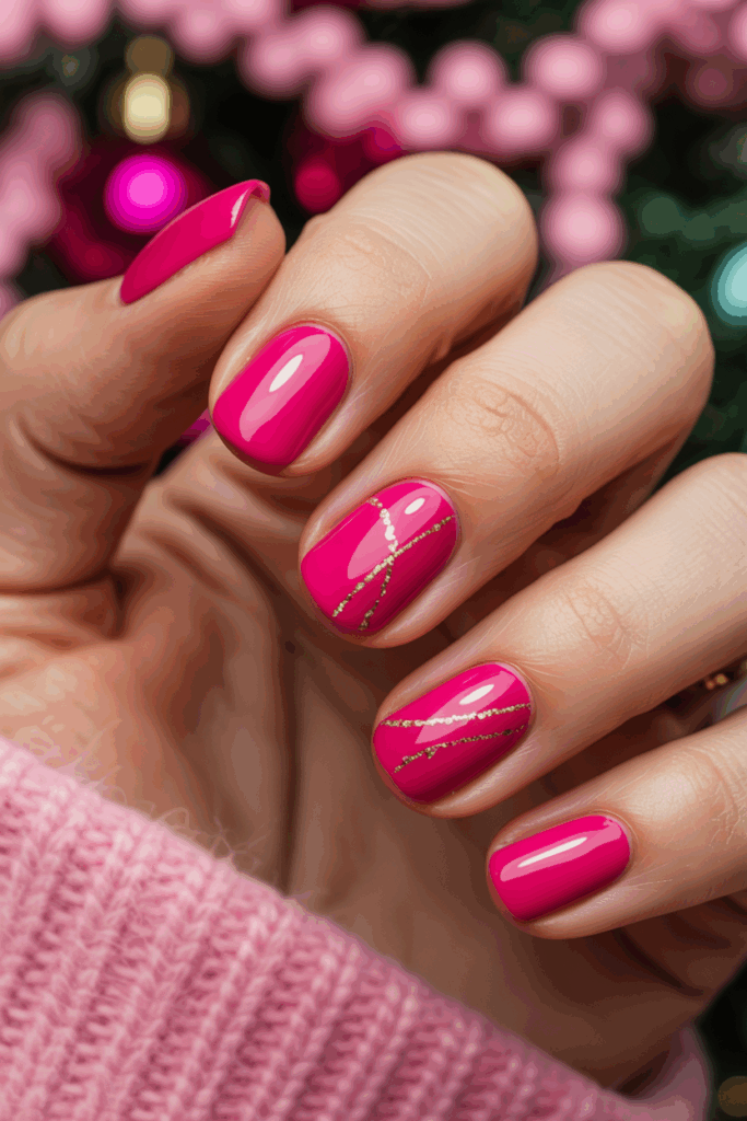 This design features bright pink nails paired with thin, elegant gold lines. The gold adds a touch of sophistication without overpowering the vibrant pink base.