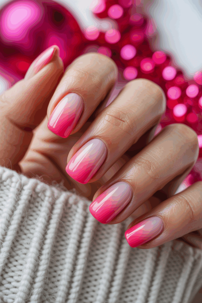 This nail design features a smooth blend from soft light pink to a bold hot pink. The gradient creates a visually appealing transition that suits the festive season without being too traditional.