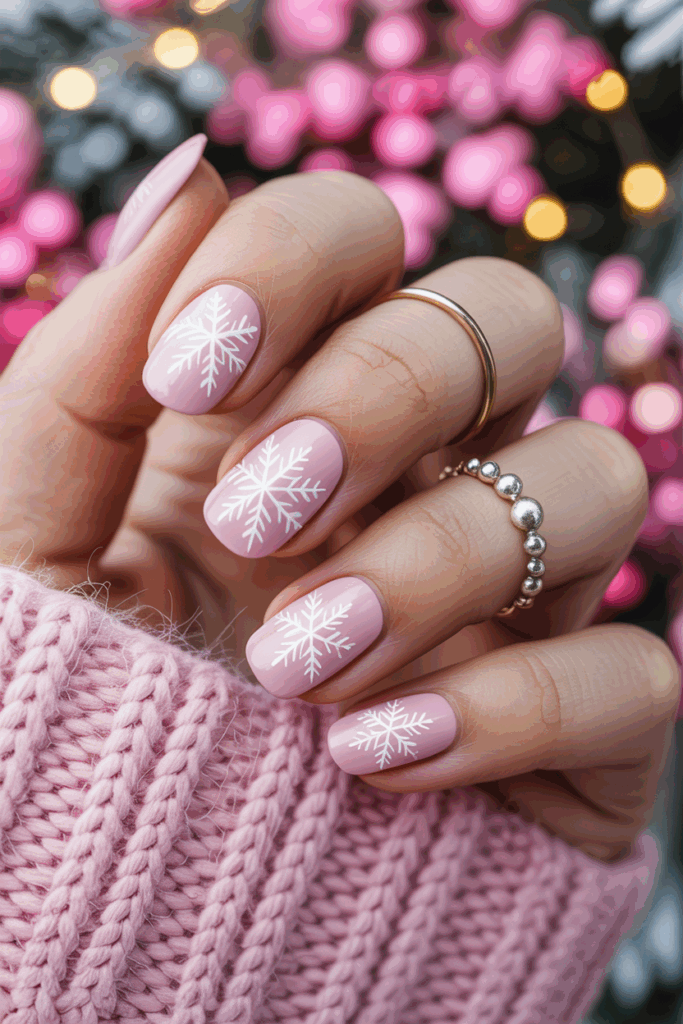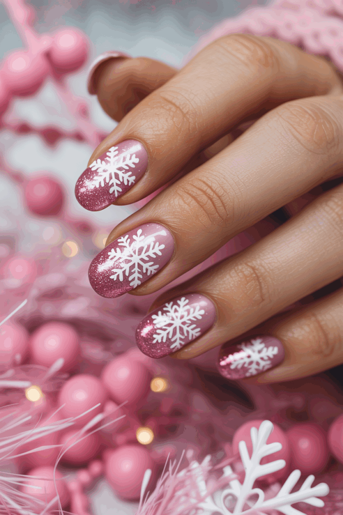 This design uses a soft pink base with glitter added for sparkle. White snowflakes are painted carefully on each nail, creating a clean, wintery look.
