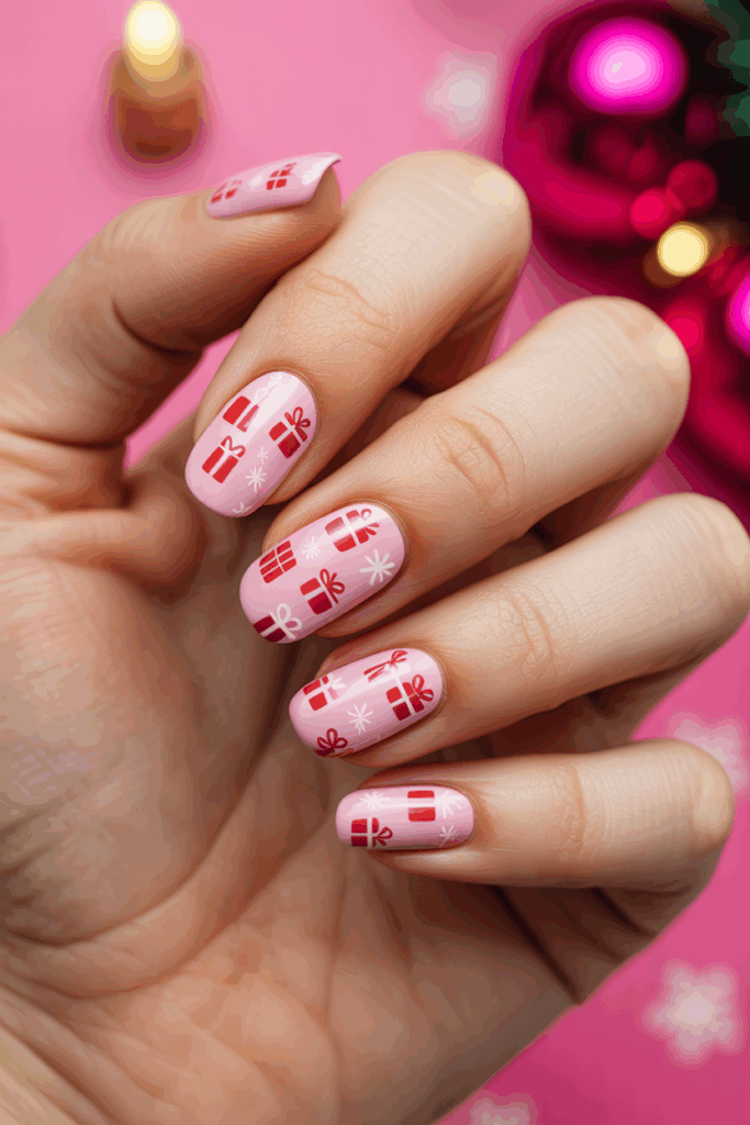 The gift shapes are simple and neat, adding a festive feel without being too bold. This style suits short or medium nails well. It works for casual or more formal holiday events.