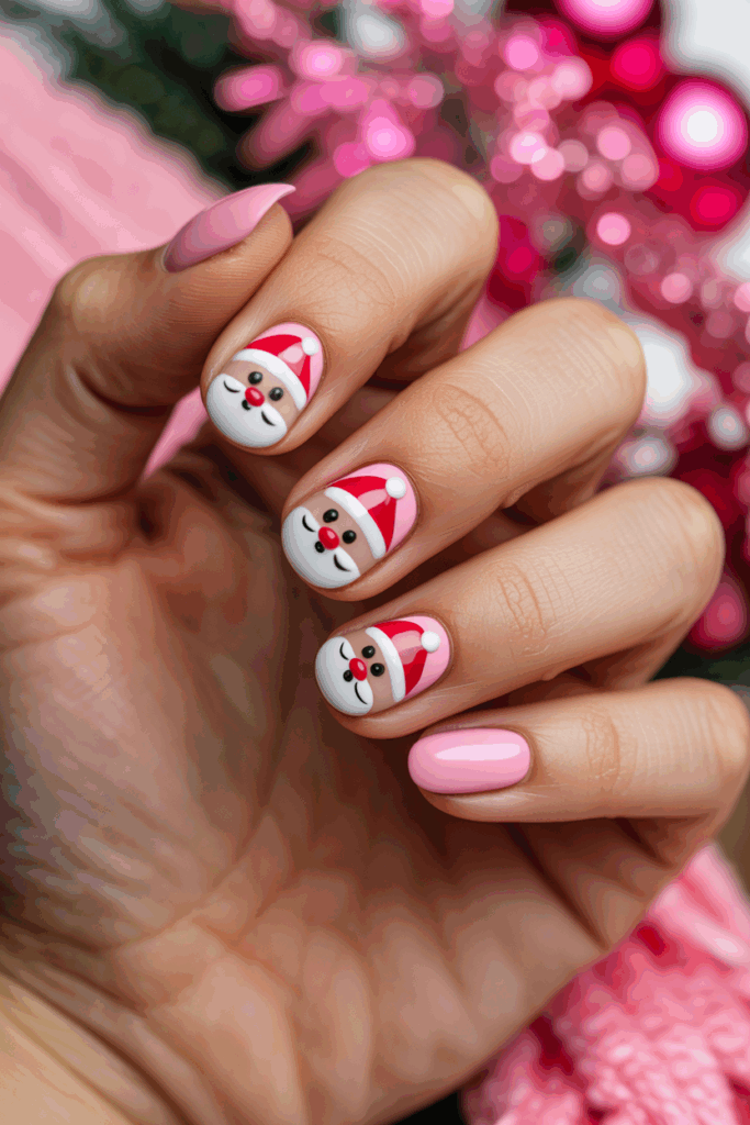 9) Pink Nails with Mini Santa Faces