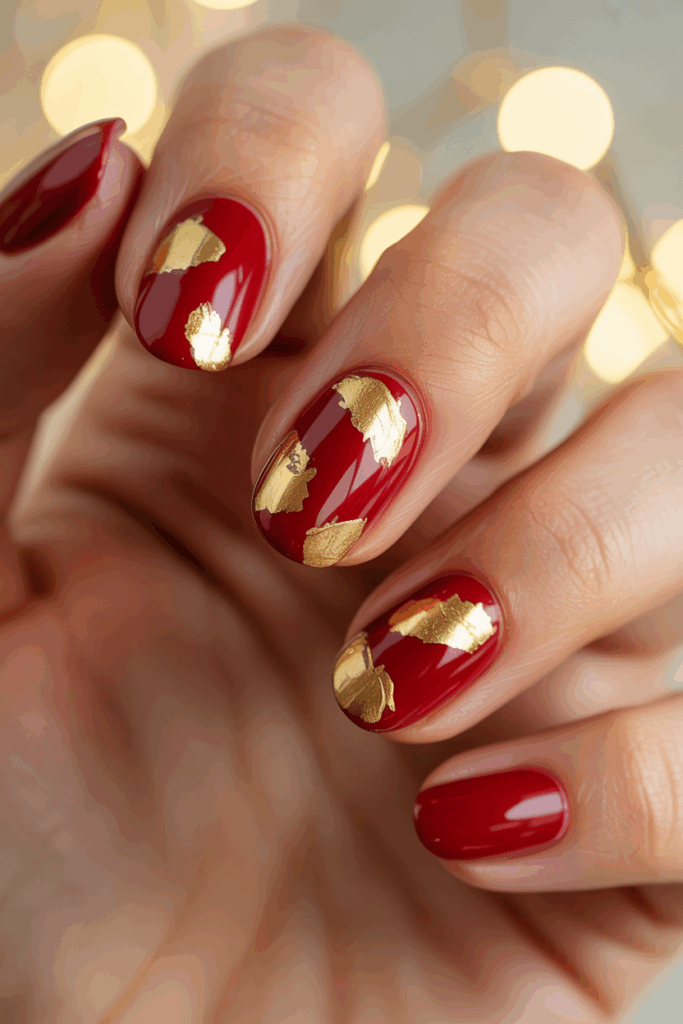 Red nails with gold foil flakes create a festive and classy look. The matte red base keeps the style simple yet bold.