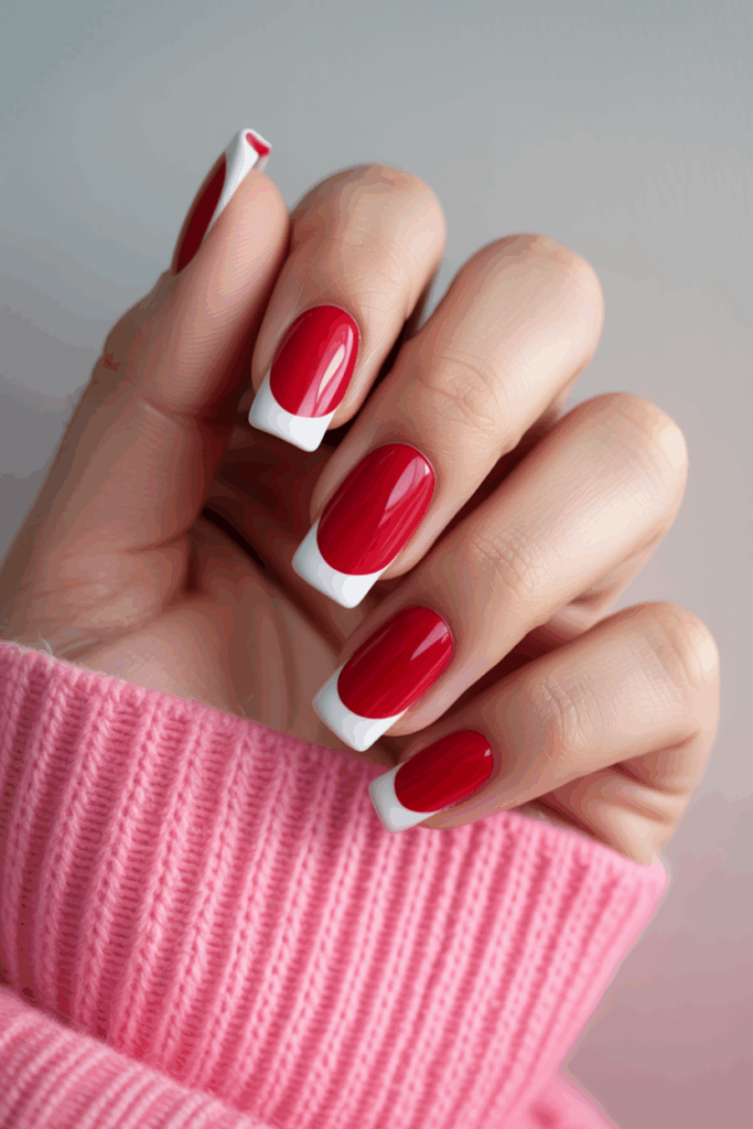 This nail design uses a clean white base with red French tips. The contrast makes the red color stand out without being too bold.