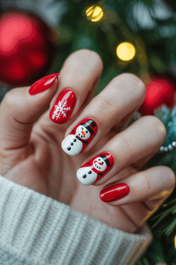This design features bright red nails as a base, creating a bold and festive look. Small snowman art is painted on one or two nails, adding a cute and playful touch.