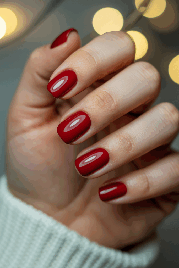 It is a versatile choice that fits both casual and formal holiday events. The sparkle highlights the deep red color, making the nails more interesting while keeping them simple.