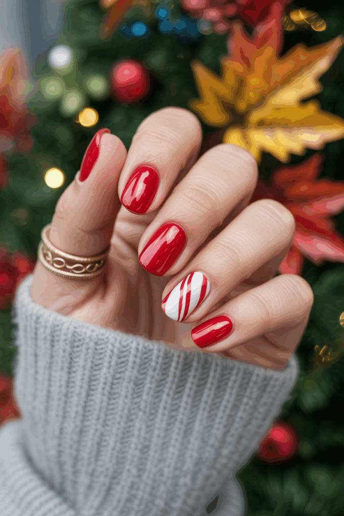 One nail has a candy cane pattern, usually the ring or middle finger. The stripes are red and white, adding a festive touch.