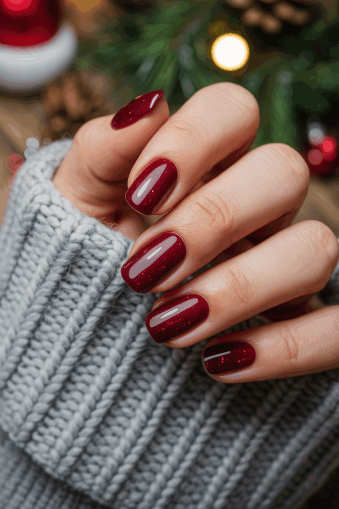 Dark red nails offer a rich and elegant look for the holiday season. Adding a subtle sparkle gives the nails a soft glow without being too flashy.