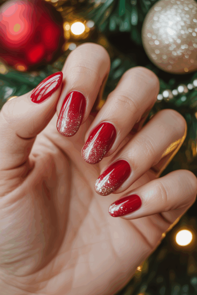 Glittery red ombre nails blend deep red shades with sparkling glitter for a festive look. The gradient effect starts with a rich red at the base and lightens toward the tip, adding depth.