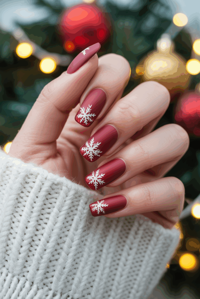 This style works well on medium-length nails. It pairs nicely with simple nail art like white snowflakes or gold accents to keep the design classic yet festive.