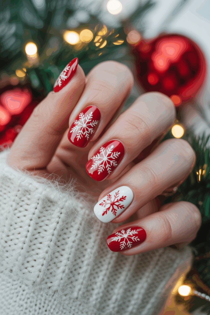 This design pairs a bright red base with white snowflake patterns. It creates a clean, classic look perfect for the holiday season.