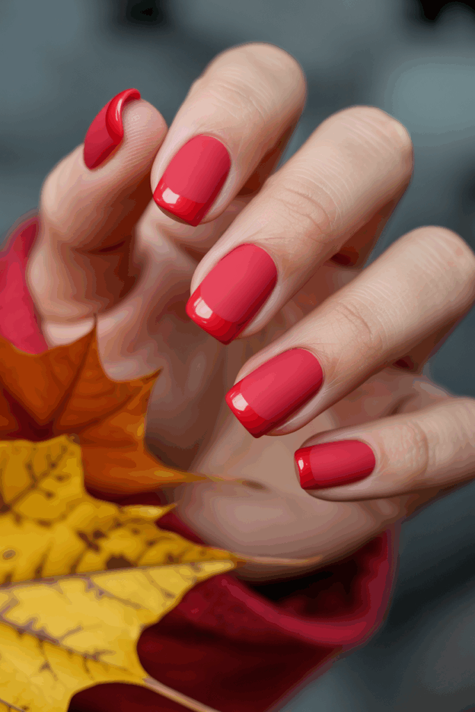 This design pairs a smooth matte red base with shiny, glossy red tips. The contrast creates a simple but stylish look.