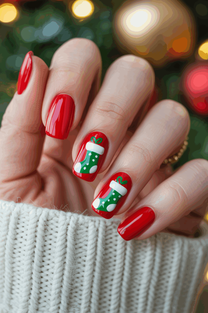 Red nails with Christmas stocking designs add a festive touch to any holiday look. The bright red base highlights the classic stocking shape in white or glitter.