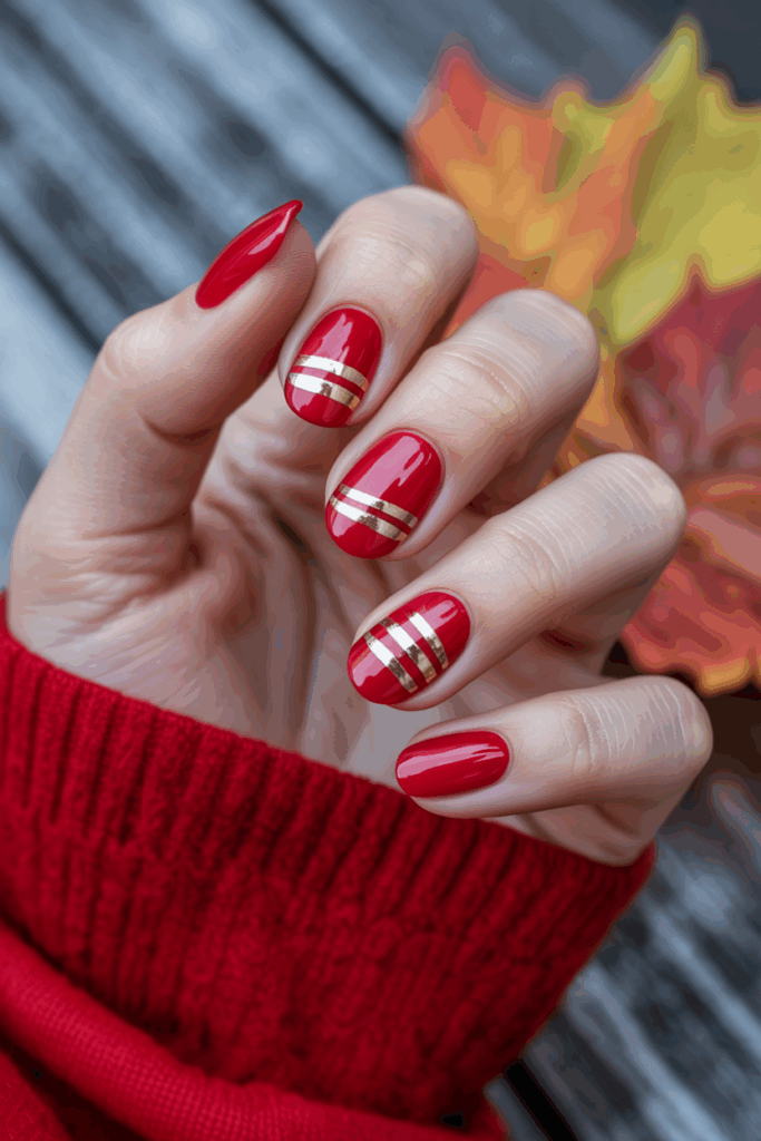 The gold lines add a modern touch, making the nails look elegant and festive. Some nails feature small gold dots between the stripes for extra detail.