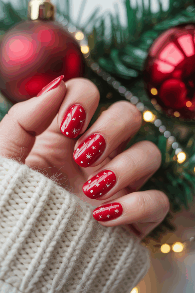 This design pairs a rich red base with tiny white star accents. The stars add a subtle festive touch without overwhelming the nails.