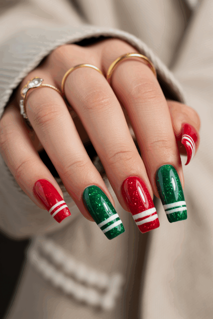 This style uses classic French tips but adds festive red and green glitter for a holiday twist. The glitter highlights the edges of the nails, bringing sparkle without overwhelming the look.
