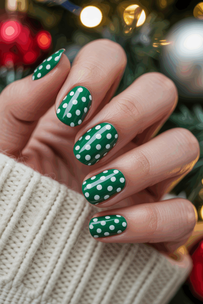 This design pairs a deep green base with small white polka dots. It creates a simple yet festive look that fits well with the holiday season.