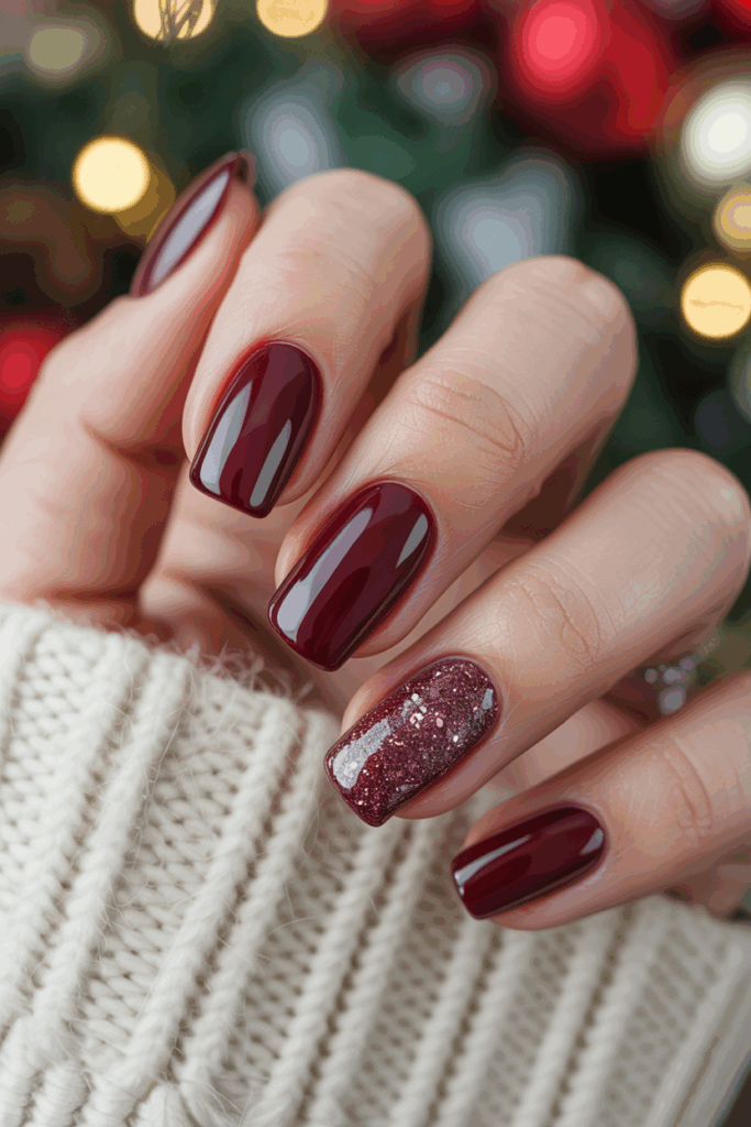 This nail style pairs deep, glossy burgundy with sparkling glitter. The shine of the burgundy polish creates a rich, elegant base.