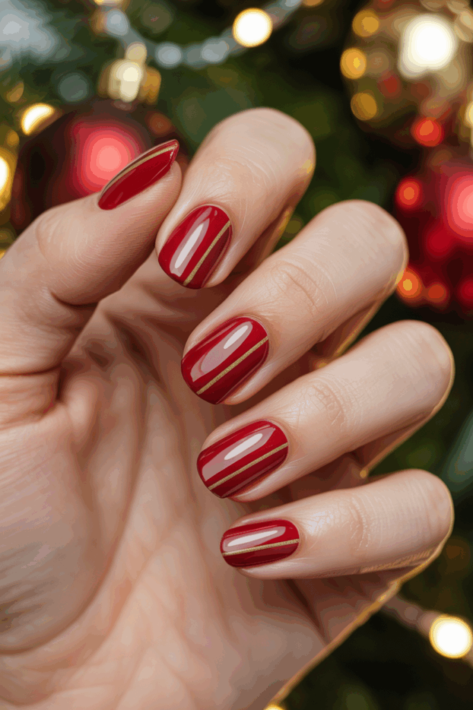 Thin gold stripes are placed carefully over the red, giving the nails a sleek, elegant look. The lines add a bit of sparkle while keeping the style simple.