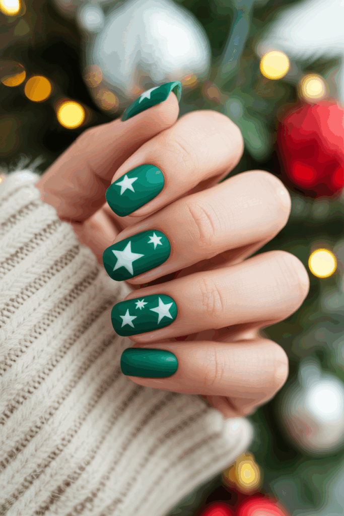The white stars give a winter feel while keeping the manicure clean and fresh. It works for casual or formal holiday events.