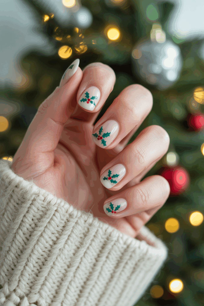 The small holly details keep the nails elegant and understated. This style works well for any skin tone and suits both short and long nails.