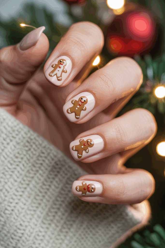 This design uses a simple nude base to keep the look clean and subtle. Tiny gingerbread men are painted on each nail, adding a festive touch without being too flashy.