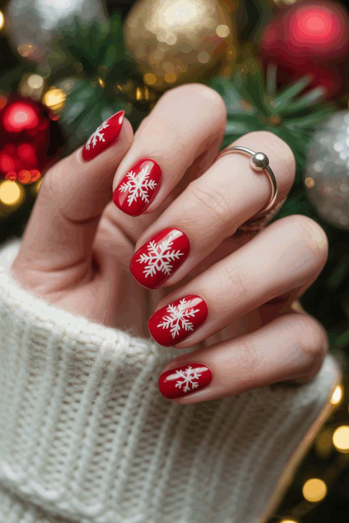 Usually, one or two nails have the snowflake details while the others stay solid red. This keeps the look balanced and easy to wear for any holiday event.