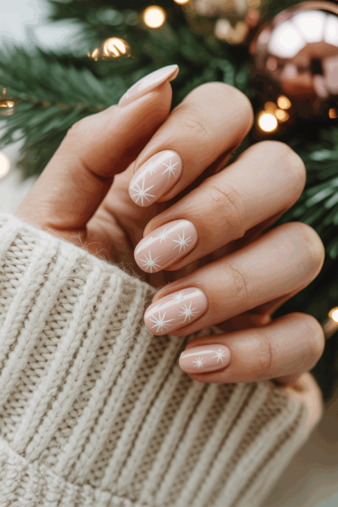This design features a soft blush base that looks gentle and elegant. Small white stars are scattered on the nails, adding a subtle festive touch without being too bold.