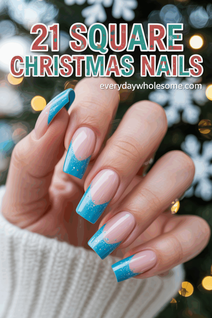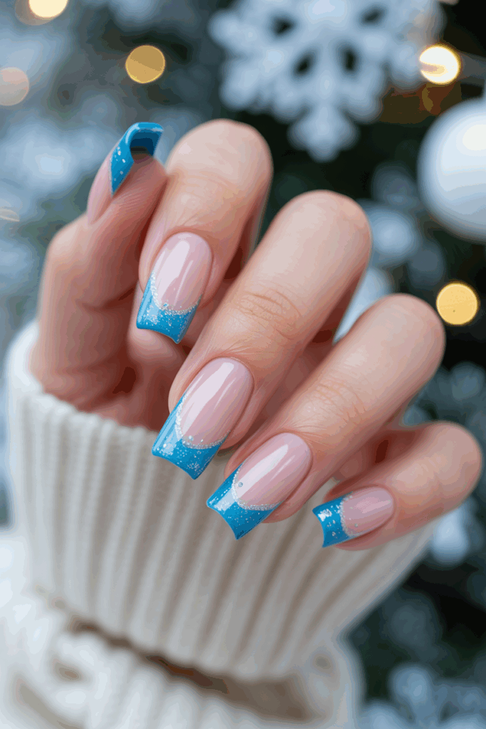 This design features clear or neutral base nails with sharp, icy blue tips. The blue color is cool and soft, perfect for winter or Christmas. The square shape gives the nails a modern and clean look.