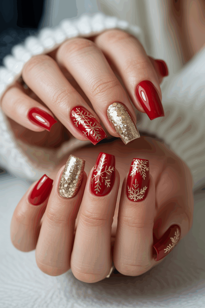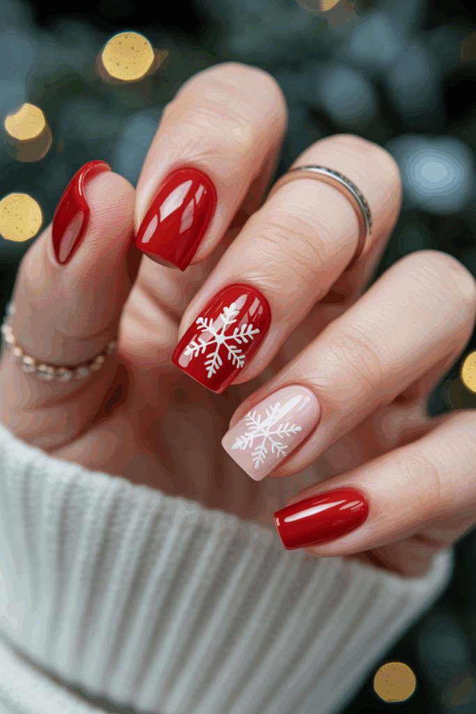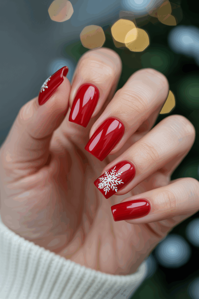 This look features bold red square nails with simple white snowflake designs. It balances festive colors with clean shapes.