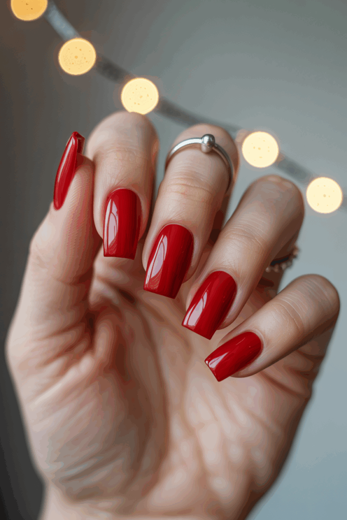 They feature a shiny finish that highlights the vibrant red color. The medium length offers a balance between style and practicality. This look fits well with holiday outfits and simple designs. It is popular for its clean, polished appearance.