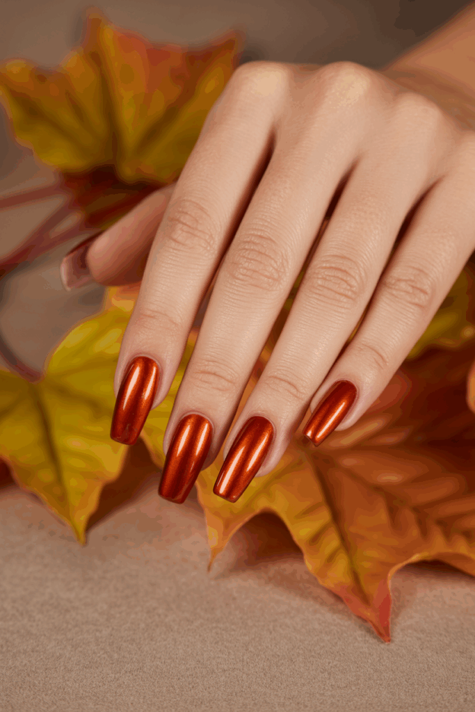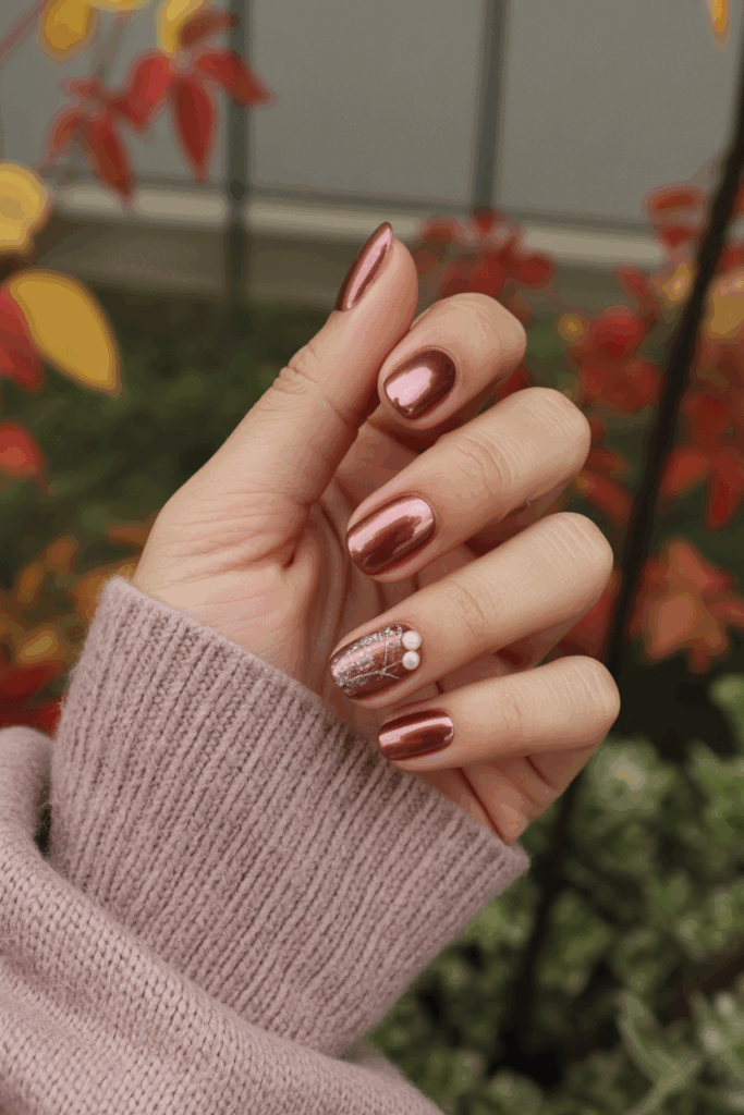 For an extra seasonal touch, copper chrome looks amazing paired with cozy fall staples like oversized knits and boots. Adding subtle accents such as fine gold lines or leafy designs can elevate the look further, turning a simple manicure into a statement piece.