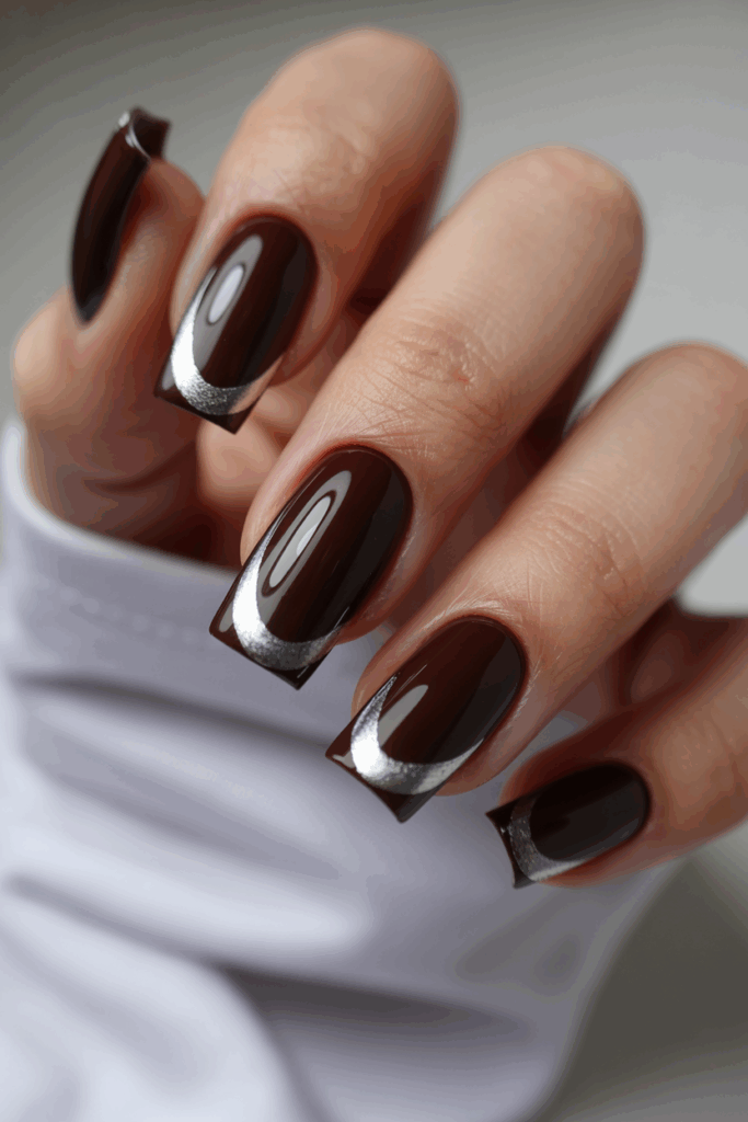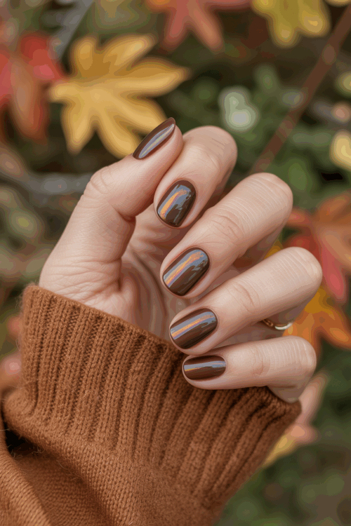 Pairing this nail design with soft, neutral sweaters or warm-toned outfits can create a lovely, cohesive look. Whether you’re heading to a casual gathering or a cozy night in, these chocolate brown nails with a holographic touch are sure to impress.
