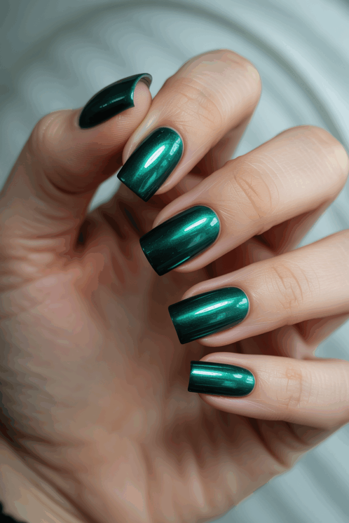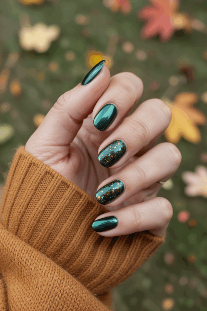 These nails can be styled in various ways. You can choose to have all your nails in emerald green or mix it up with glitter on a few accent nails. Pairing this look with cozy sweaters and autumn accessories makes it even more stylish.